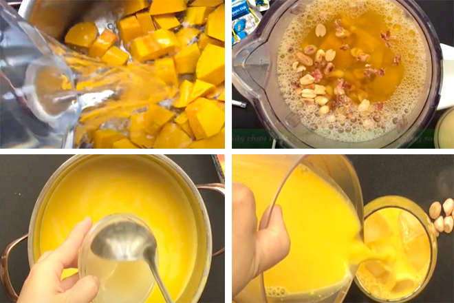 - Cho đậu phộng rang chín cùng với bí đỏ xay nhuyễn, cho thêm sữa tươi và sữa đặc.