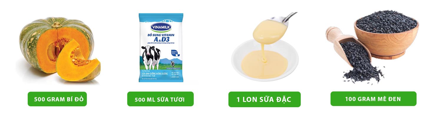 Nguyên liệu cho món sữa bí đỏ mè đen: