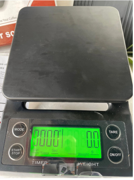 – Bật nút ON/OFF (màu đỏ) được lắp đặt trên mặt trước để cân hoạt động, đảm bảo rằng đã lắp pin tiểu AA vào phía sau sản phẩm. Đợi 1-2s để màn hình hiển thị trên cân về vị trí 0 gram.