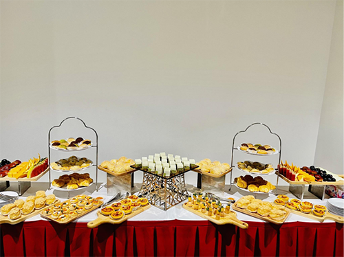 Tại khu vực tiệc trà, phải có setup một bàn tiệc nhỏ, bày trí một số món ăn để mọi người có thể đến thưởng thức và giao lưu với nhau. Ngoài ra, có thể bố trí thêm khu vực làm bục sân khấu để dành cho các tiết mục văn nghệ tươi vui khuấy động không khí.