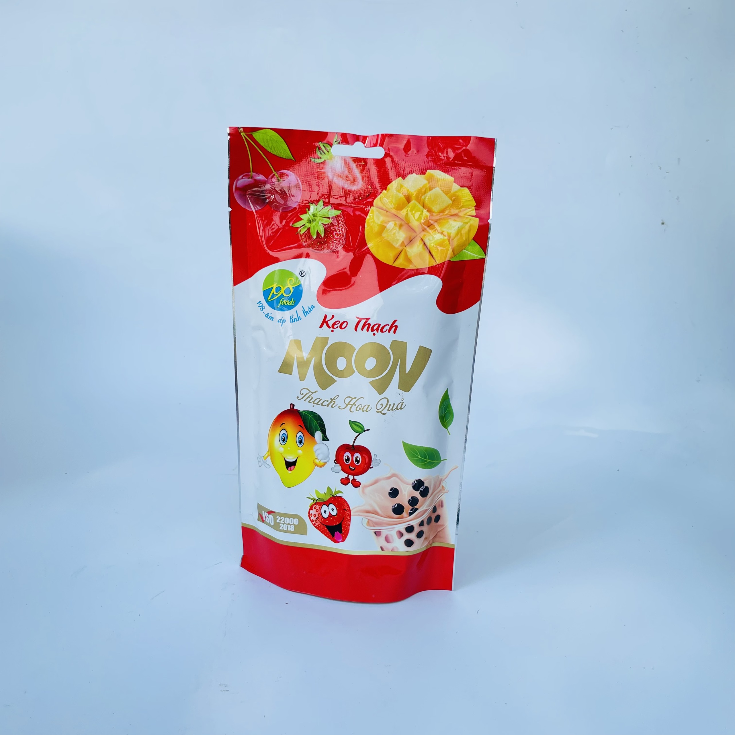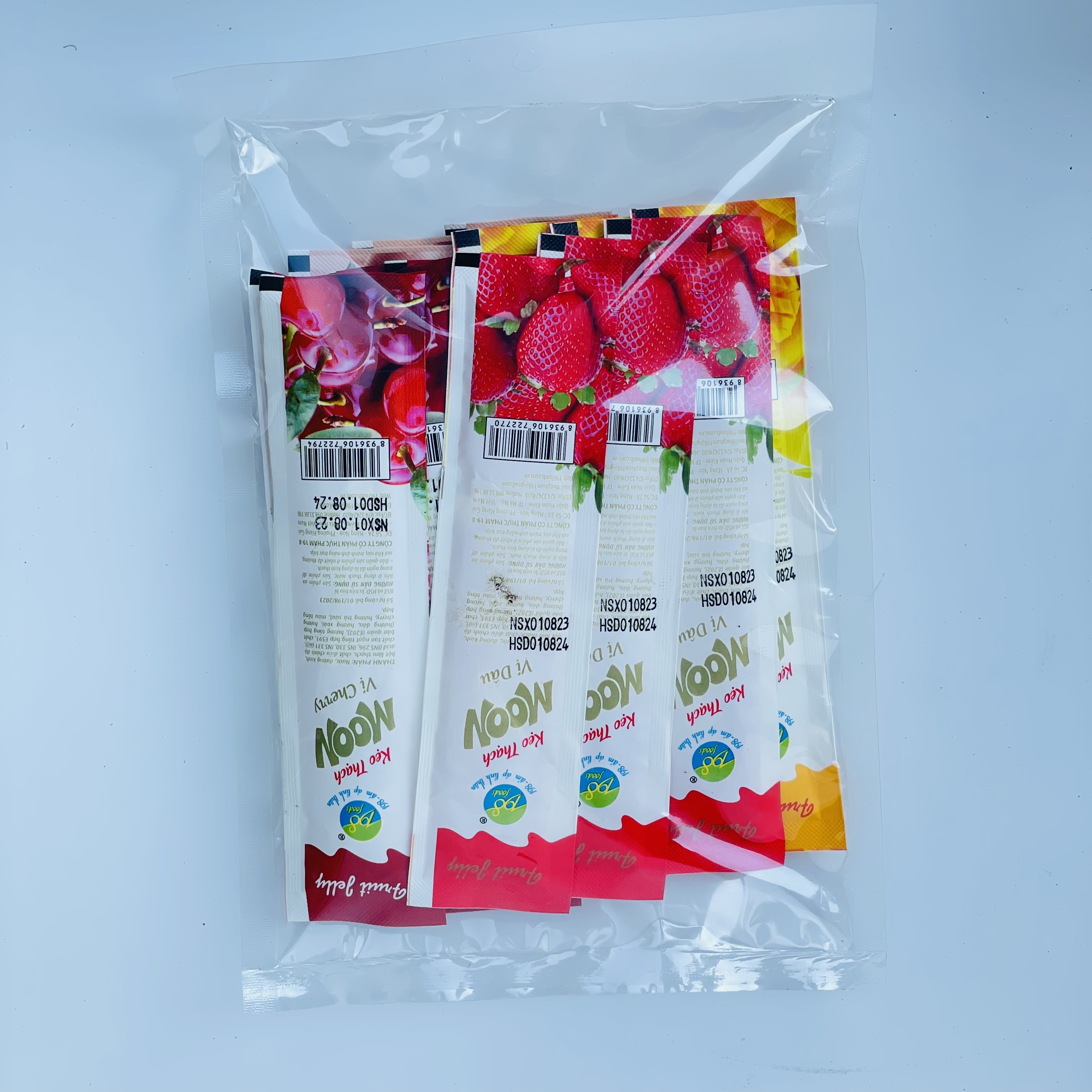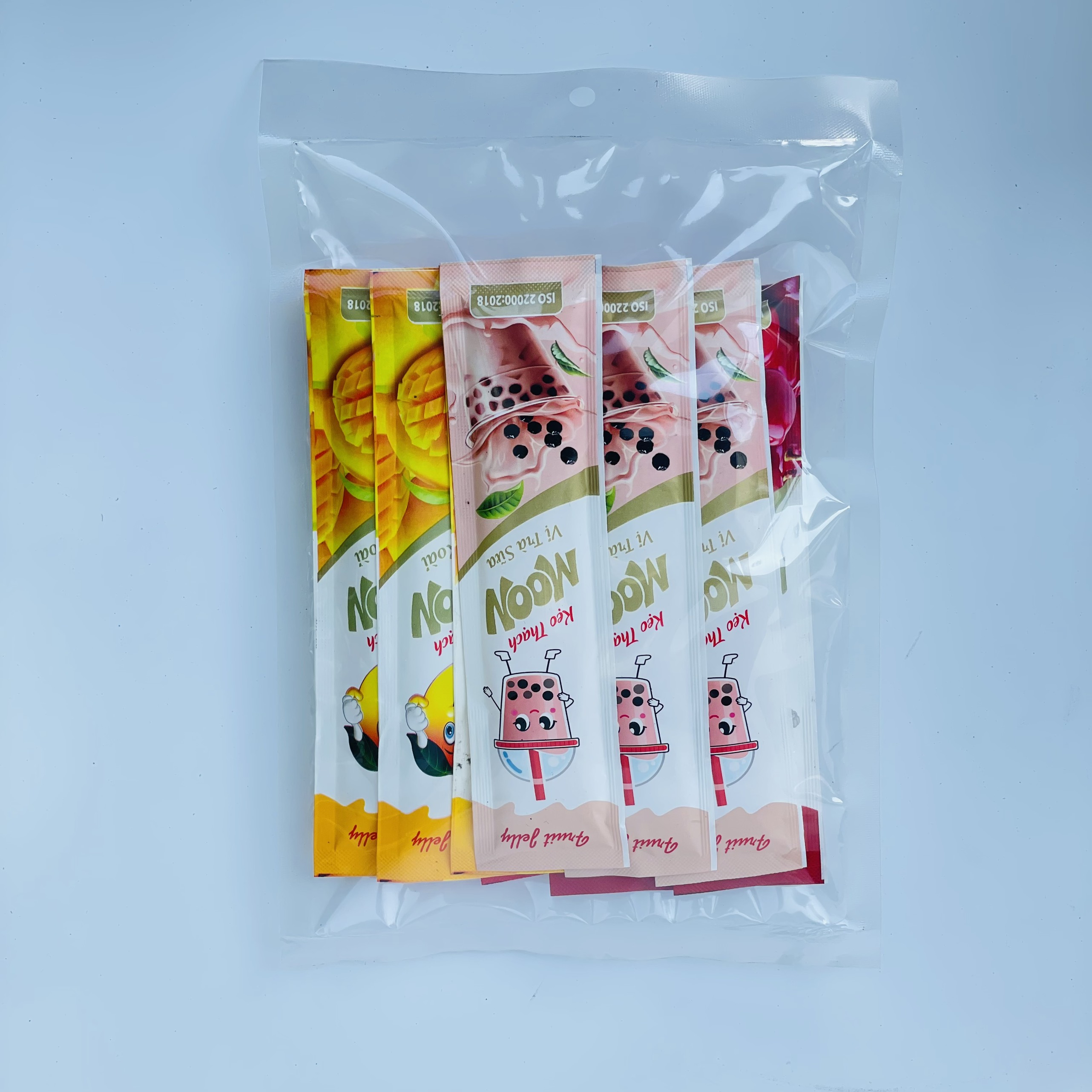 Thành phần: Nước, đường kính, bột làm thạch, chất làm dày, chất điều chỉnh độ axit, chất tạo ngọt tổng hợp, chất bảo quản, hương thực phẩm tổng hợp (hương đào, hương việt quất, hương chanh leo, hương dưa, hương nho, hương me, hương dứa, hương táo, hương khoai môn, hương dâu, hương xoài, hương vani), màu thực phẩm tổng hợp...