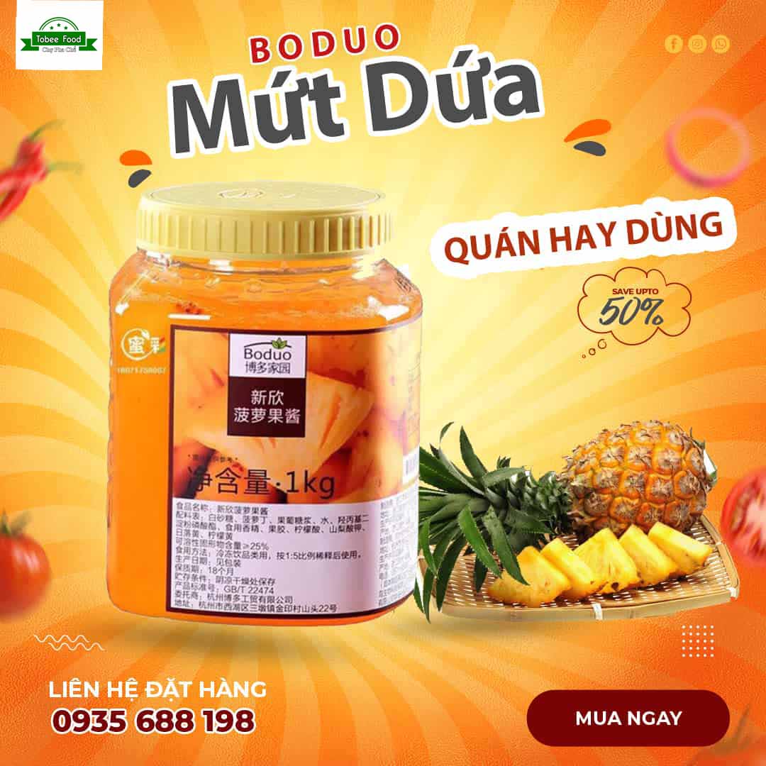 Mứt Dứa (thơm) Boduo là sản phẩm thương mại bởi công ty Tobee Food, sản phẩm đạt tiêu chuẩn an toàn. Giá cả rẻ hơn so với chất lượng, được nhiều người tin dùng sử dụng. Tobee Food với đội ngũ nhân viên tư vấn cùng các chuyên gia có kinh nghiệm trong lĩnh vực pha chế sẽ hỗ trợ bạn một cách tốt nhất.