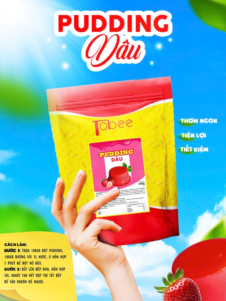 Ngoài ra, bột pudding dâu Tobee còn là nguyên liệu tuyệt vời cho những món bánh ngọt như bánh pudding, bánh flan, bánh tart, hay bánh bông lan. Bạn có thể dùng bột pudding dâu Tobee để làm nhân cho bánh, hoặc để tạo ra một lớp phủ thơm ngon trên bề mặt bánh.