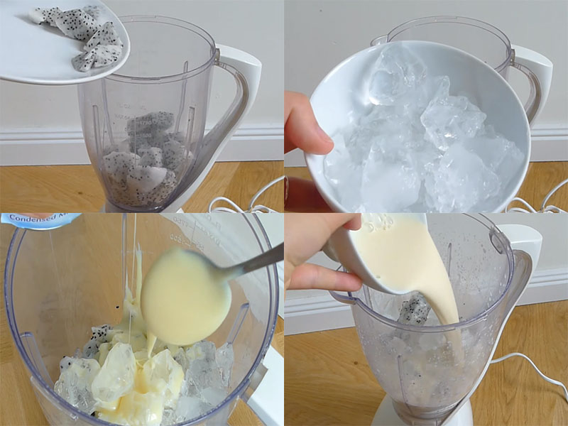 - Bước 2: Xay sinh tố. Cho tất cả các nguyên liệu đã chuẩn bị ( thanh long, sữa đặc, đường kính ) vào một máy xay. Xay với công suất lớn cho đến khi hỗn hợp trên thật nhuyễn mịn rồi cho một vài viên đá vào. Tiếp tục xay đến khi đá mịn hoàn toàn thì tắt máy.