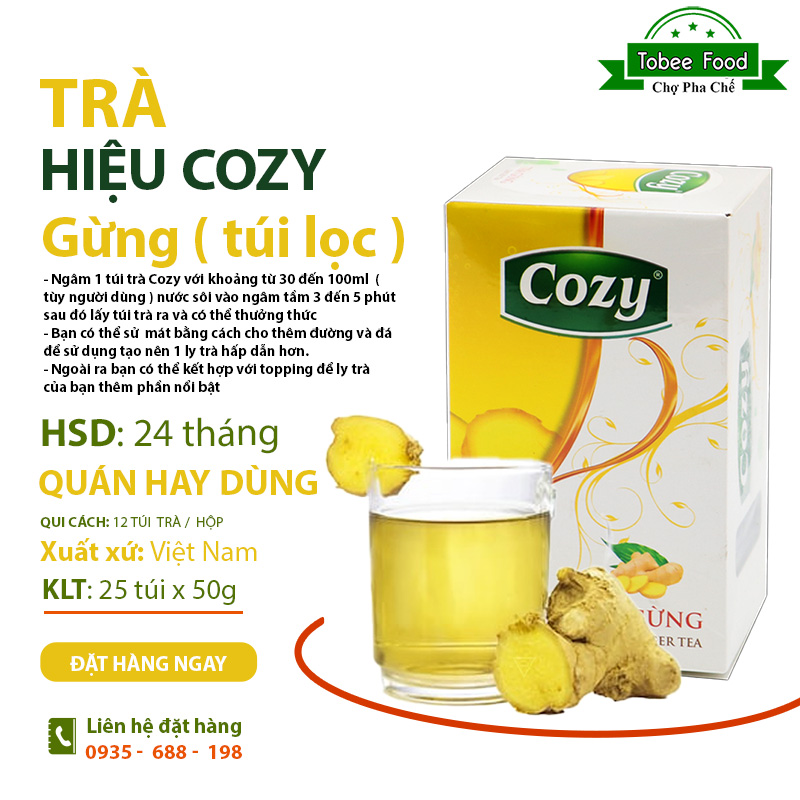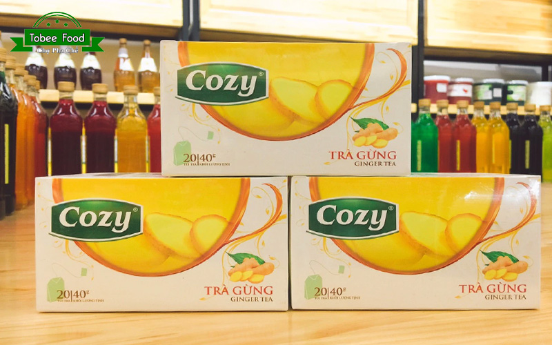Trà gừng Cozy có nhiều công dụng trong việc trị bệnh về đường tiêu hóa và giải cảm lạnh, giải rượu... Vị trà Cozy độc đáo nhờ sự pha trộn của các thành phần gừng, lá chè xanh, sả khô và lá chanh mang lại một ly trà thơm lừng thư giãn “đúng gu”. Trà được đóng gói trong từng túi lọc mang đến sự tiện lợi và nhanh chóng trong bảo quản và pha chế.